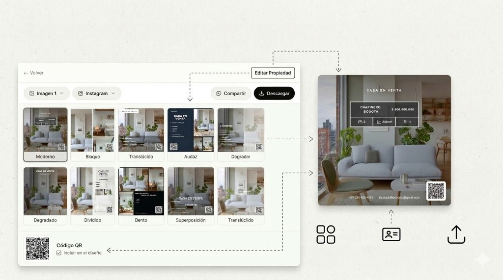 Cada gráfico incluye un código QR que enlaza directamente al inmueble en tu sitio web. Los interesados escanean y llegan al listado completo — conectando lo offline con lo digital.